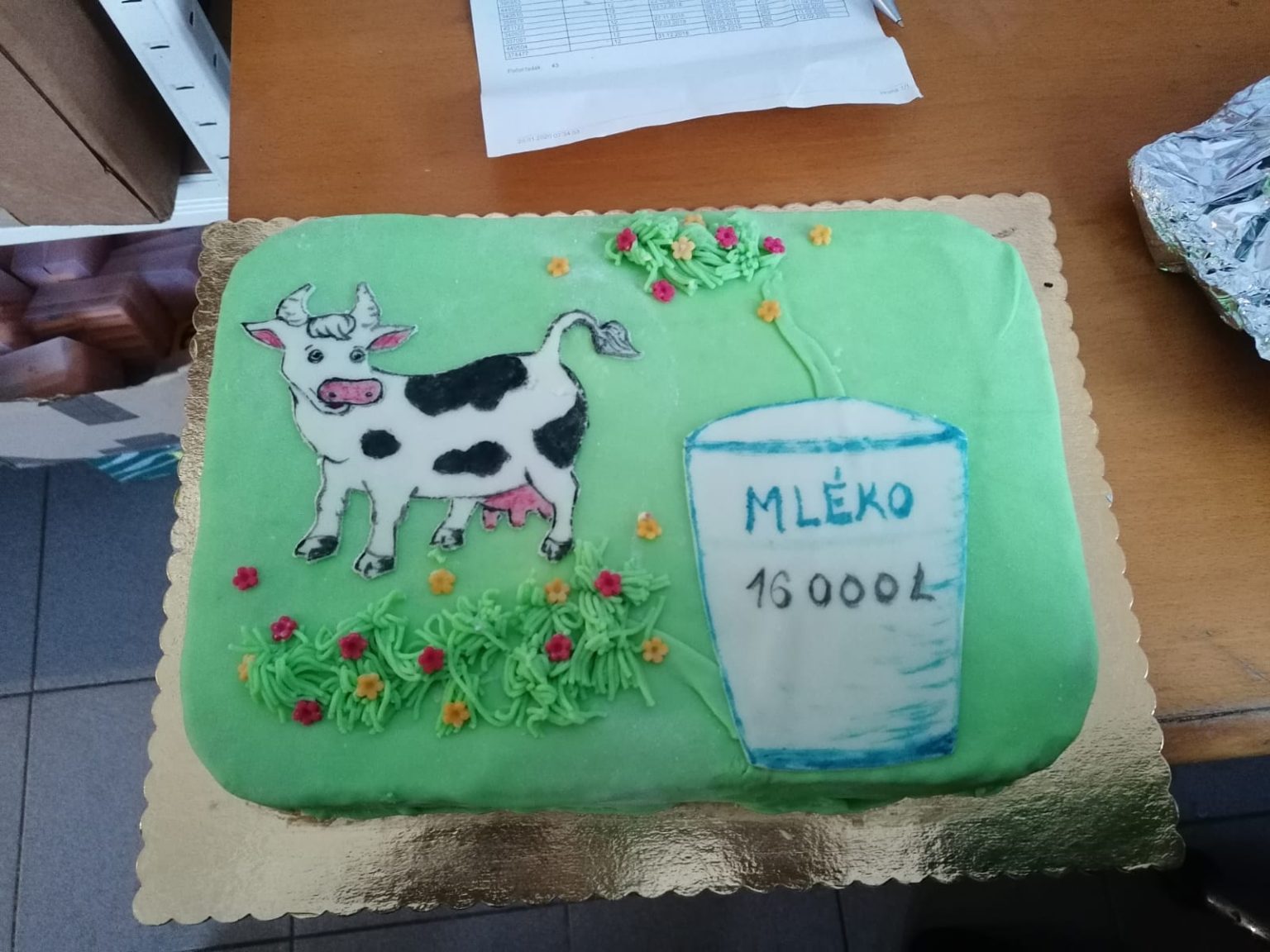 Předání dortu pracovníkům mléčné farmy v Českých Petrovicích za pokoření denní dodávky mléka 16000 litrů v měsíci lednu.