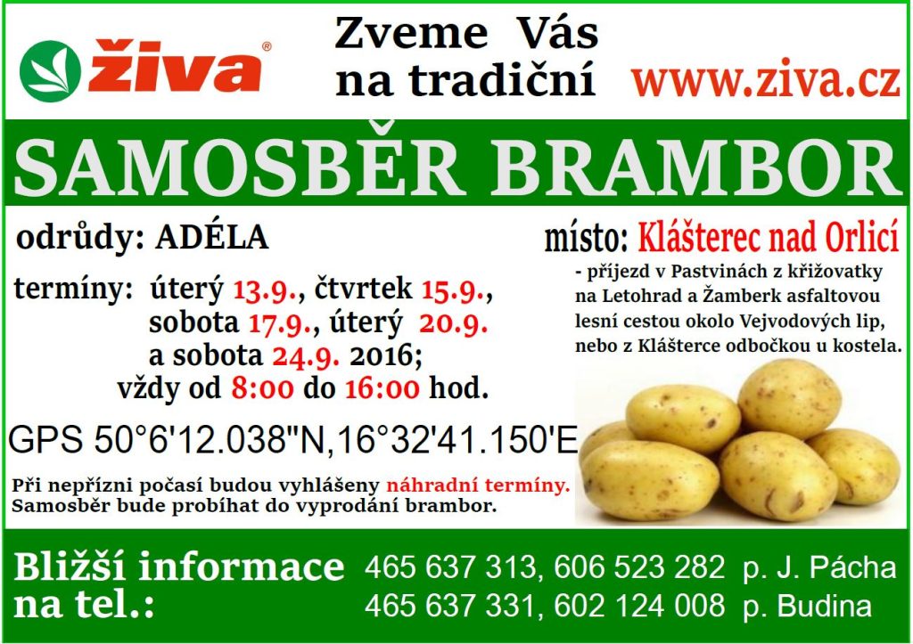 29.08.2016Zveme Vás na tradiční samosběr brambor v Klášterci nad Orlicí. Cena brambor je 4Kč / kg.